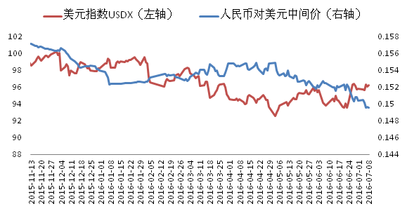 周内人民币对美元贬值0.53%,同期美元指数[3]收于96.21,美元指数周内涨幅为0.42%(图二)。在7月8日晚间(北京时间)6月美国靓丽的新增非农数据出炉,远超预期并创8月之最,这或将进一步推升美元指数。