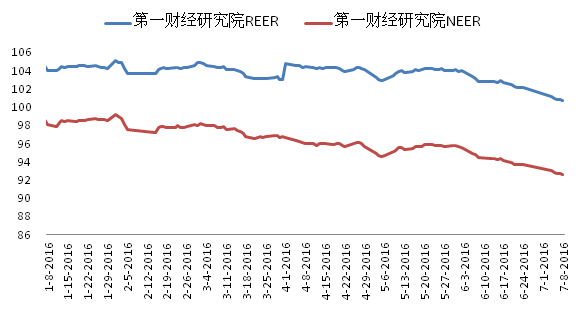 图一:第一财经研究院NEER与第一财经研究院REER 2016年内走势(截至2016年7月8日)