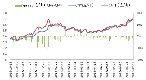 周内在岸离岸汇差波动区间为-72至-207个基点,较上周有所收窄,截止7月8日,在岸和离岸美元对人民币汇率分别收于6.6881和6.7018(图三)。
