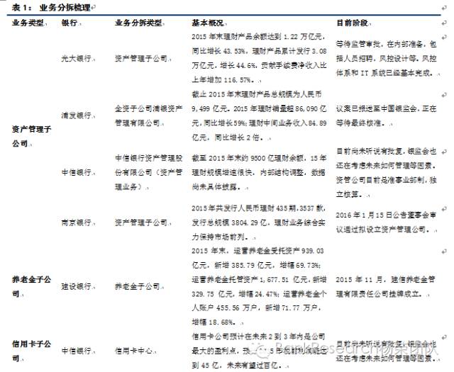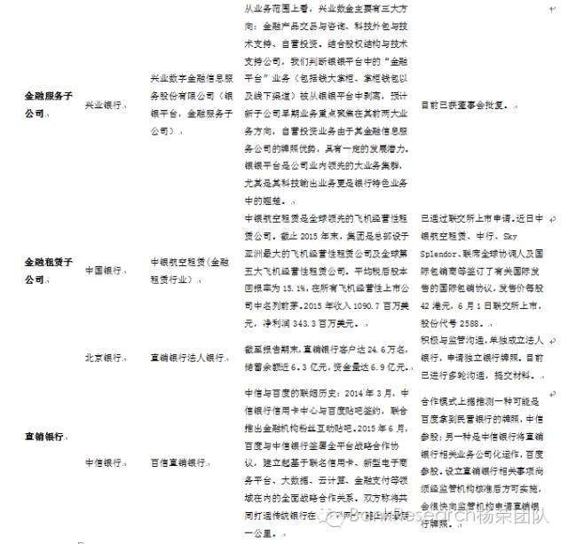 吕随启进一步表示,被拆分的部门有没有稳定的盈利模式也有待观察,同时,原来的银行主体已经上市,被分拆的部门业务和主体间都是有关联的,所以再融资对原来的主体也会有影响。中银航空租赁IPO公开募股 银行子公司上市首单将落地5月18日,中国银行(601988.SH,3988.HK)控股的中银航空租赁有限公司(2588.HK)宣布拟将在香港联交所主板上市,净募资42.46亿港元(约5.47亿美元)。中银航空租赁本次发售2.08亿股,新股份、销售股份各占一半。中银航空租赁称,拟将募资款项用作交付前付款及日后购买新飞机,以扩大自有机队。中银航空租赁本次IPO发售价为每股42港元,相当于2015年融资后市净率的1.25倍,对应市值291.48亿港元。该公司将于5月19日在香港公开发售,预计将于6月1日开始在香港联交所买卖。根据Wind数据,中银航空租赁1.25倍的市净率,高于国际同行Air Lease(AL.N)0.97倍、AerCap(AER.N)0.91倍的市净率,但低于中国飞机租赁(1848.HK)2.2倍的市净率(截至5月17日)。IPO文件显示,中银航空租赁发行总规模为87.45亿港元,新股份、销售股份各占一半,并视乎超额配股权行使与否而定。若超额配股权全数行使,募资总额为100.56亿港元。中银航空租赁已与基石投资者签订协议,包括国资背景的中国投资有限责任公司、丝路基金有限责任公司、国开国际控股有限公司、中国人寿富兰克林资产管理有限公司,外资背景的Oman Investment Fund、Hony Capital Group, L.P.、Fullerton Fund Management Company Ltd.,以及亿利资源集团有限公司、复兴国际有限公司、波音公司和南方工业资产管理有限责任公司。11家基石投资者同意认购或促使其指定实体认购约1.08亿股、51.7%的发售股份总数(假若行使超额配股权)。本次IPO后,中国银行仍将是中银航空租赁的绝对控股股东。Bank资管小编(个人微信号bankziguan01):近年来,随着银行业利润增长明显放缓,息差收窄,不良率上升,多家银行发力综合化经营,分拆业务也获得了监管层的首肯。2015年年初,银监会发布《中国银行业监督管理委员会2014年报》时表示,将积极推动银行业务管理框架改革,探索部分业务和条线的子公司制改革,重点应该在理财和同业部门,这也有利于风险的管理。此后监管层亦在多次重要会议上表态支持银行理财、信用卡、私人银行、直销银行等业务探索子公司制。根据公开信息初步整理,2015年3月31日,光大银行董事会同意全资设立理财业务子公司。2015年5月27日,浦发银行宣布以全资子公司的方式设立浦银资产管理有限公司。2015年7月9日,中信银行董事会审议同意开展信用卡业务公司化改制,拟由中信银行和中信银行子公司出资共同设立中信信用卡公司。2015年9月24日,兴业银行董事会同意设立兴业数字金融信息服务股份有限公司,被业界称之为“银银平台”分拆的雏形。中金公司此前发布的一份研报指出,银行做旗下资产的分拆乃至最终上市,是混合所有制改革的应有之义。这些业务(如理财、信用卡、私人银行等)较为市场化,被纳入现有银行体系作为一个部门运作在机制、薪酬等方面都不适应日趋激烈的市场竞争。中金报告预计,先被分拆的是银行理财,其次是信用卡和私人银行,投行、金融市场、托管等新兴业务也有分拆可能。部分银行在互联网金融领域也可能尝试分拆或成立新的子公司。平安证券银行业分析师励雅敏、黄耀锋、袁喆奇此前在研报中点评称,银行在混业经营及分拆方面的长期趋势已不可逆。来源:BankResearch杨荣团队(ID:cscyangrong)《银行业周报21期》作者:中信建投证券 杨荣 本周专题我们总结了上市银行已经公告的业务分拆成立子公司的情况,希望有助于投资者了解行业内这一趋势的全貌。我们预计分拆独立成立子公司在下半年将成为热点。从2015年以来,各类子公司分拆屡见不鲜,涉及资产管理业务(4例),养老金业务(1例),信用卡业务(1例),金融服务IT业务(1例),金融租赁(1例),和直销银行业务(4例)。其中中银租赁公告将于6月1日联交所上市,子公司分拆已进入实质性阶段。大行中仅建行和中行参与分拆,分别是养老金子公司和金融租赁子公司,并已先后进入落地实施阶段。股份行和城商行参与较广,但目前仍在审批阶段。光大、浦发、中信、南京等陆续宣布拟成立资产管理子公司,北京、宁波、民生、中信等也纷纷谋求成立独立直销银行法人机构。监管层对此两项业务分拆也均表示积极态度,但仍有待批复。中信银行多点开花,拟分拆资管业务,信用卡业务,并和百度实现跨界合作,实现真正意义上的“互联网+金融”,成立百信银行直销银行。中信银行提供风险管理,百度提供大数据和客户,其将获得直销银行牌照,作为行业内第一家实现互联网金融业务子公司化经营的上市银行,其估值可以引领行业。对业务发展的影响包括:(1)实现独立考核体系,激励机制完善;(2)风险控制管理,实现风险隔离;(3)有利于专业化发展,形成新的金融牌照,培养竞争能力。此外,通过子公司分拆,如中信银行信用卡业务,若比照海外信用卡公司估值PB约3倍,中国银行金融租赁业务,按照42港元每股,对应PE约9.3倍,PB约1.31倍,均高于母公司的估值,利于估值抬升,但由于母公司体量较大,提升空间有限。