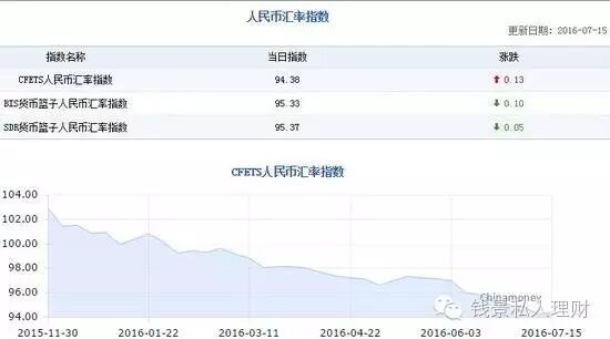 据统计截至7月15日CFETS人民币汇率指数报94.38点,较2015年年末贬值6.498%。CFETS人民币汇率指数以2014年12月末为基期,指数记为100点。