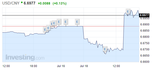 今日(7月18日),人民币对美元中间价下调156点至6.6961,为2010年10月以来新低。上周五人民币中间价报6.6805元,16:30收盘报6.6804元,23:30收盘报6.6890元。