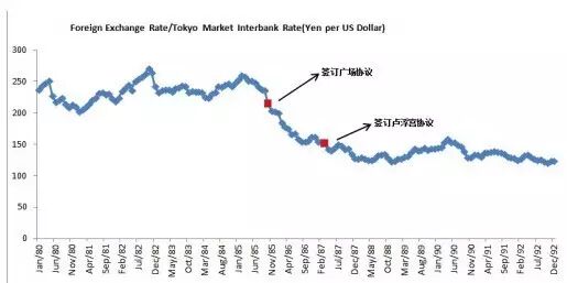 第三,人和方面,政府主导的本币升值政策不是日本房地产泡沫的罪魁祸首。普遍认为,1985年的广场协议是日本房地产的分水岭,在广场协议和卢浮宫协议签订之间的一年半时间里,日元兑美元升值近40%(具体详见下表),严重影响了其国内的产业结构。然而,笔者关注到,从1985年1月至1987年年底,马克兑美元升值101.27%,法郎升值100.55%,英镑升值66.98%。如果说广场协议的负面影响,应当是日本政府在应对本币升值的环境下,使用扩张性货币政策和宽资本流入政策方面的严重失误,而欧洲多数国家则合理控制了流动性指标,未出现大开大合的窘境。具体内容在此不另赘述,有兴趣的读者可以从很多渠道了解更加详细的信息。