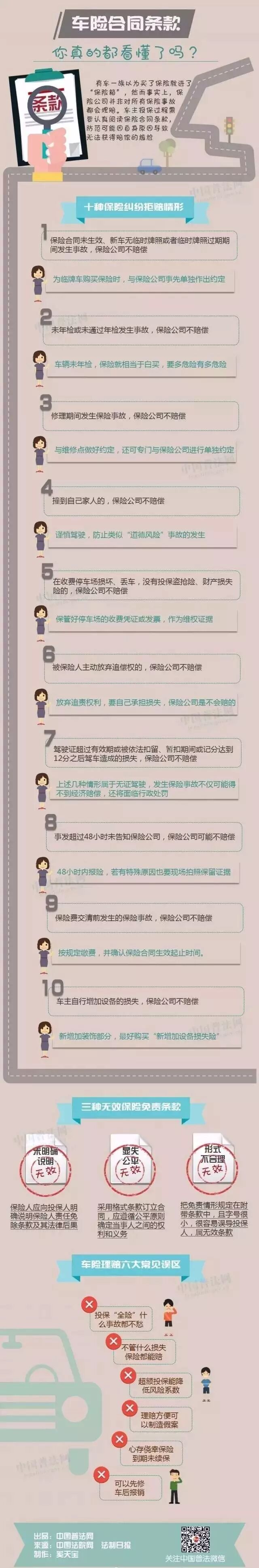 有车一族以为买了保险就进了“保险箱”,然而事实上,保险公司并非对所有保险事故都会理赔。车主投保过程需要认真阅读保险合同条款,防范可能因自身原因导致无法获得赔偿的尴尬。一图教你看懂车险合同条款!详见↓