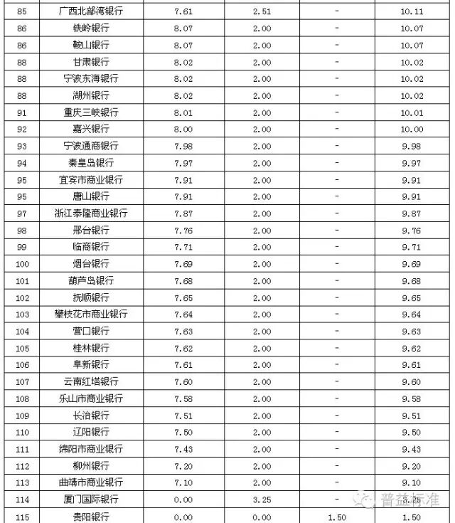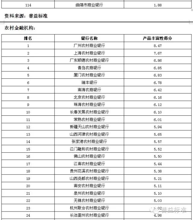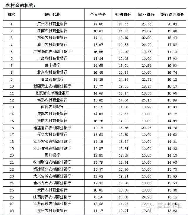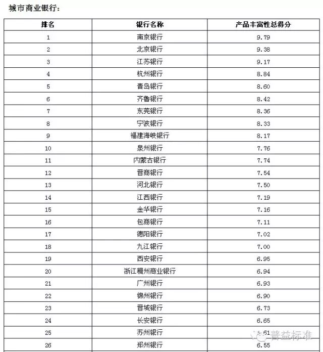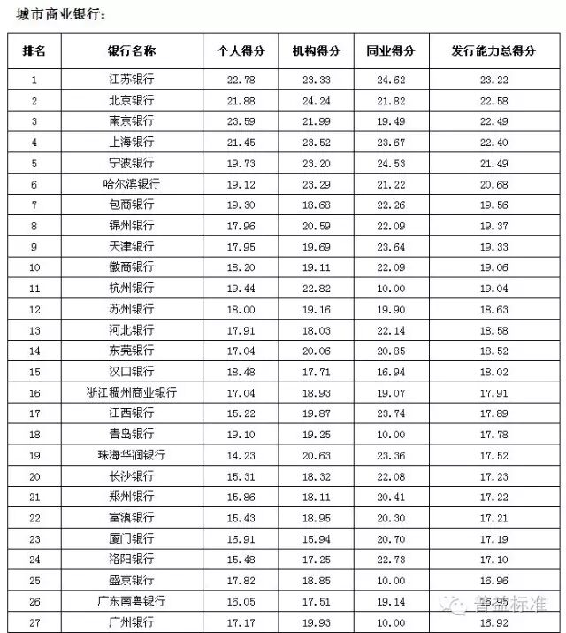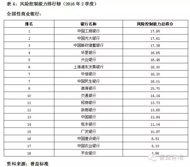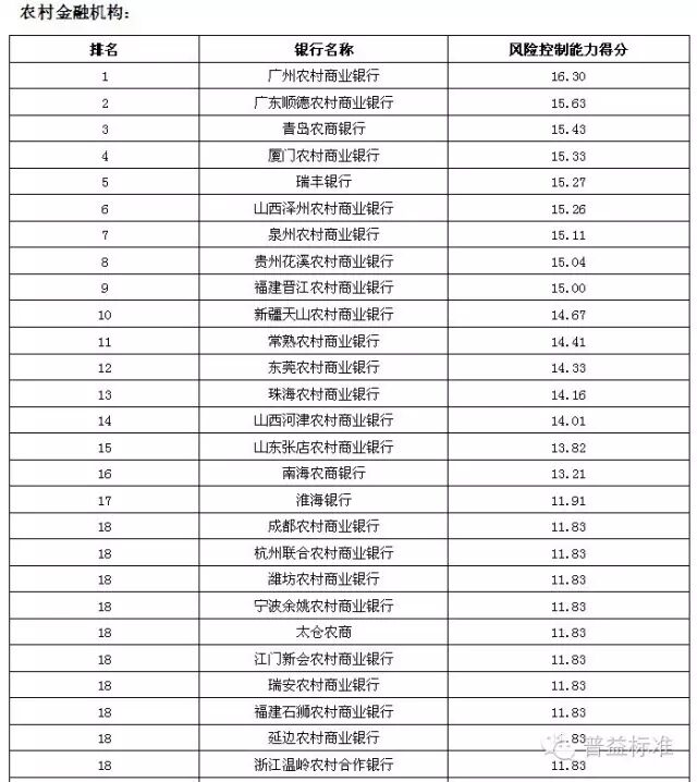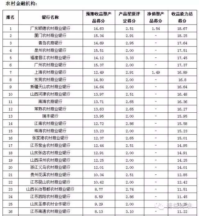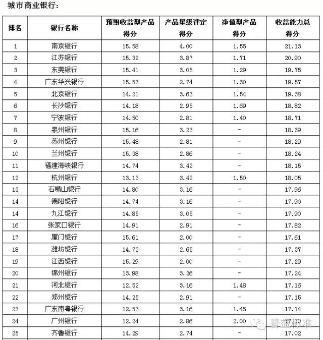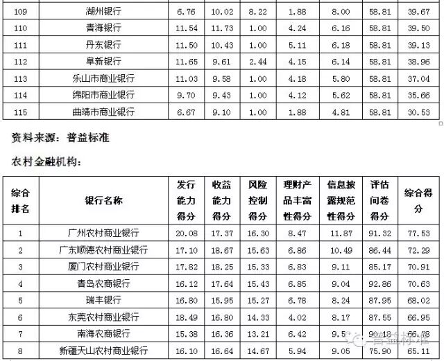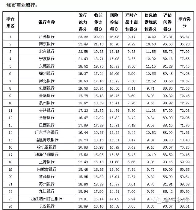 理财能力综合排名前五的全国性银行依次是兴业银行、中信银行、中国工商银行、中国民生银行和中国光大银行;城市商业银行中,理财能力综合排名前五的银行依次是江苏银行、南京银行、北京银行、宁波银行和东莞银行;农村金融机构排名前五的银行分别为广州农村商业银行、广东顺德农村商业银行、厦门农村商业银行、青岛农村商业银行和瑞丰银行。 银行理财发行能力排名前五的全国性银行依次为中国工商银行、招商银行、交通银行、农业银行和浦发银行;发行能力排名前五的城市商业银行依次为江苏银行、北京银行、南京银行、上海银行和宁波银行;发行能力排名前五的农村金融机构依次为广州农村商业银行、江南农村商业银行、东莞农村商业银行、厦门农村商业银行和广东顺德农村商业银行。 银行理财收益能力排名前五的全国性银行依次为招商银行、广发银行、兴业银行、中信银行和渤海银行;收益能力排名前五的城市商业银行依次为南京银行、江苏银行、东莞银行、广东华兴银行和北京银行;收益能力排名前五的农村金融机构依次为广东顺德农村商业银行、厦门农村商业银行、青岛农商银行、泉州农村商业银行和福建晋江农村商业银行。 风险控制能力排名前五的全国性银行依次为中国工商银行、中国光大银行、中国邮政储蓄银行、华夏银行和兴业银行;风险控制能力排名前五的城市商业银行依次为是江苏银行、南京银行、青岛银行、包商银行和东莞银行;风险控制能力排名前五的农村金融机构依次为广州农村商业银行、广东顺德农村商业银行、青岛农商银行、厦门农村商业银行和瑞丰银行。 理财产品丰富性排名前五的全国性银行依次为中信银行、兴业银行、中国光大银行、中国银行和平安银行;理财产品丰富性排名前五的城市商业银行依次为南京银行、北京银行、江苏银行、杭州银行和青岛银行;理财产品丰富性排名前五的农村金融机构依次为广州农村商业银行、上海农村商业银行、广东顺德农村商业银行、青岛农商银行和厦门农村商业银行。 信息披露规范性排名前五的全国性银行依次为中国民生银行、华夏银行、渤海银行、兴业银行和上海浦东发展银行;信息披露规范性排名前五的城市商业银行依次为南京银行、江苏银行、宁波银行、河北银行和北京银行;信息披露规范性排名前五的农村金融机构依次为广州农村商业银行、上海农村商业银行、广东顺德农村商业银行、鄞州银行和成都农村商业银行。