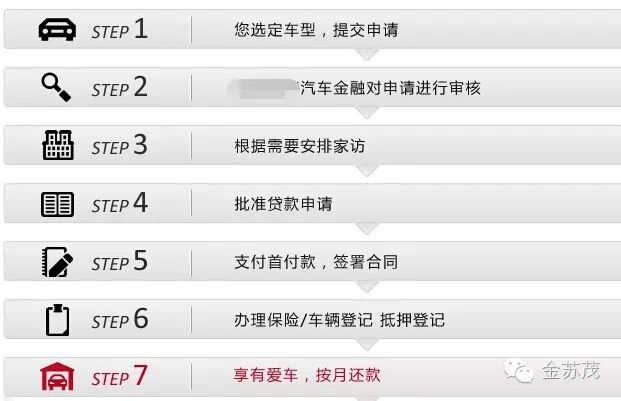 注册贷款平台账号----选择购车经销商----到店提交材料审批----通过审批----签约----放款----提车。