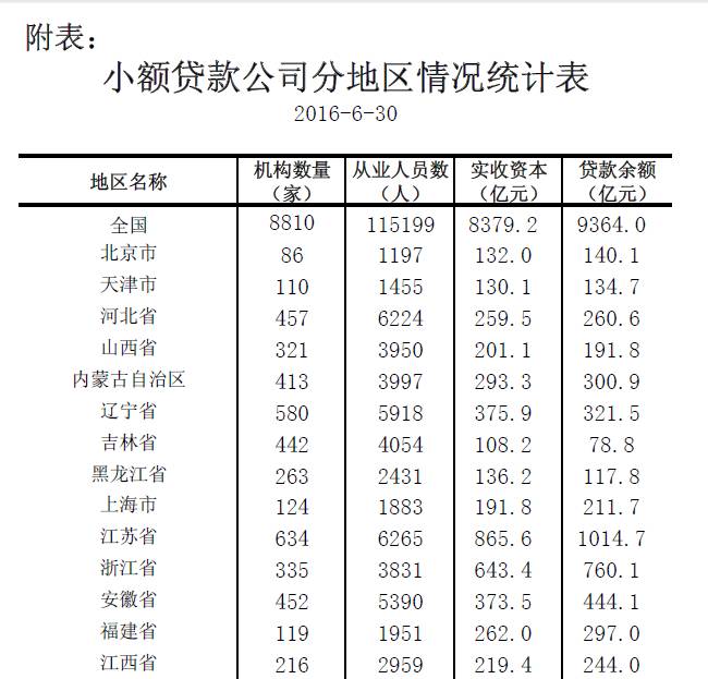 截至2016年6月末,全国共有小额贷款公司8810家,贷款余额9364亿元,上半年人民币贷款减少40亿元。