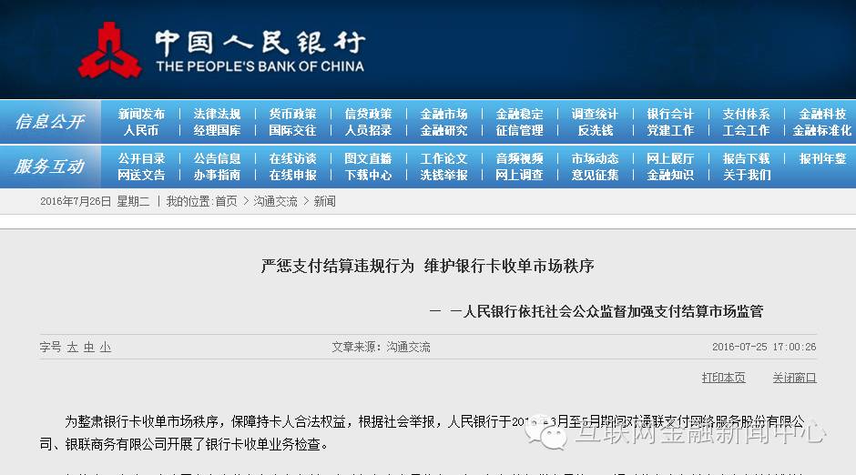 根据7月25日央行在官网发布消息称,为整肃银行卡收单市场秩序,保障持卡人合法权益,根据社会举报,央行于2016年3月至5月期间对通联支付网络服务股份有限公司、中国银联子公司银联商务有限公司开展了银行卡收单业务检查。