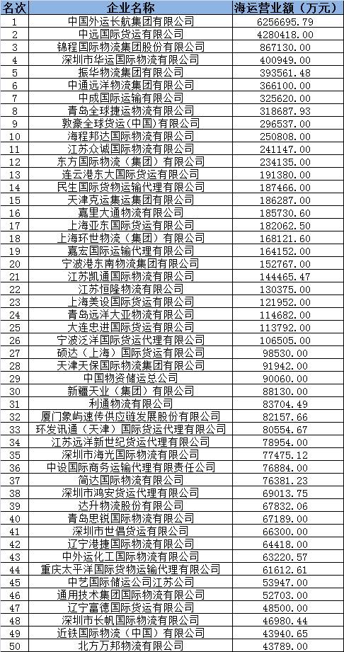 在海运榜中,位居前三位的分别是中国外运长航集团、中远国际货运有限公司和锦程国际物流集团,海运板块的营业收入分别为625.669亿元、428亿元、86.713亿元。
