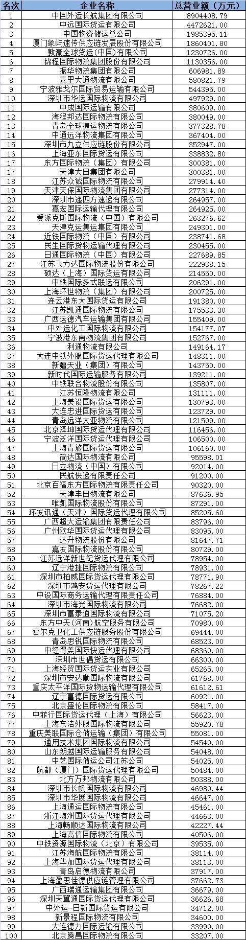 综合榜中,中国外运长航集团、中远国际货运有限公司、中国物资储运总公司分别以890.448亿元、447.262亿元、198.539亿元的总营业收入,位列前三名。