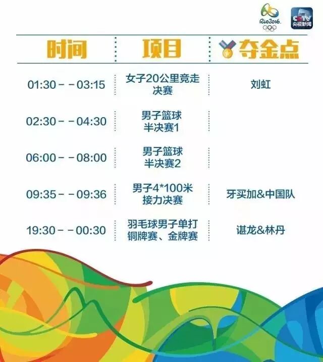 中国队看点:12日,张继科、马龙将力争会师乒乓球男单决赛。田径赛打响,中国选手开始在男女20公里竞走、女子铅球、男子跳高、4×100米接力等项目向奥运奖牌发起冲击。
