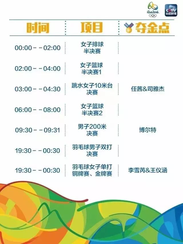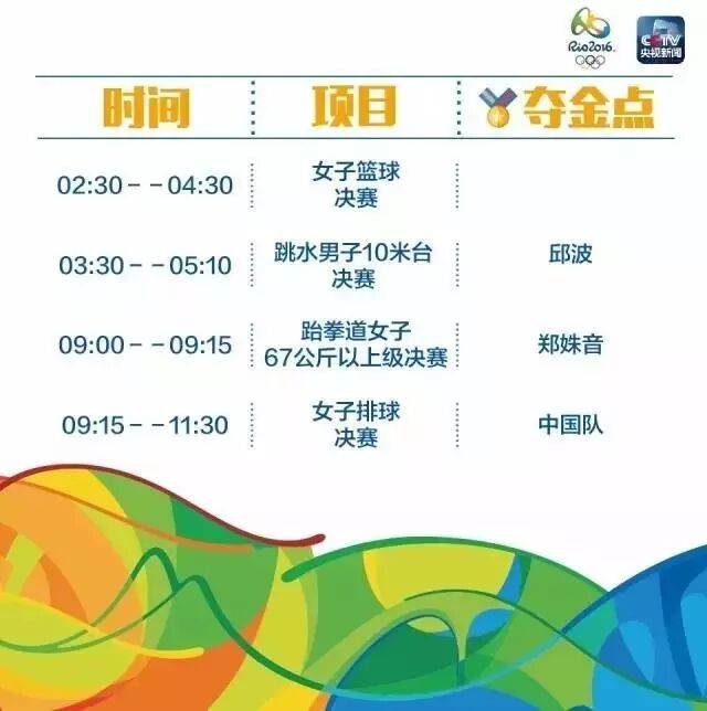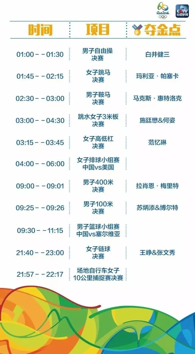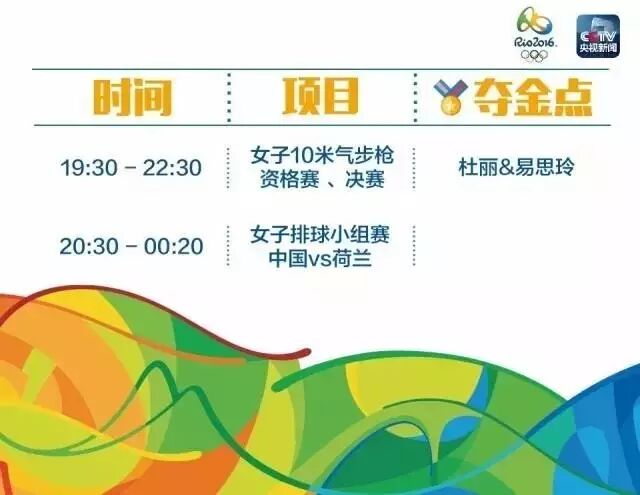 同日上演的乒乓球女团决赛,李晓霞、刘诗雯和丁宁期待将金牌稳稳地收入囊中;羽毛球混双赛场将决出首枚金牌,世界排名第一的张楠/赵芸蕾有望上演开门红;男子跳高赛场,张国伟期待跳得更高,触碰到奥运奖牌。