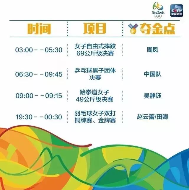 中国队看点:女子摔跤赛场,69公斤级的周凤是冠军的有力争夺者。在今年初的里约测试赛上,她得到冠军,展现出令人期待的实力与潜力。乒乓球男团决赛上演,由马龙、张继科、许昕组成的“最强天团”将力争奥运三连冠;跆拳道女子49公斤级,已实现奥运两连冠的吴静钰,时隔3年后重回世界第一,如果她能成功夺金,将是史上首位三夺奥运冠军的跆拳道选手。
