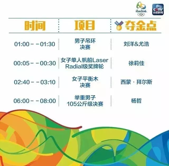 中国队看点:在体操吊环比赛中,小将尤浩和刘洋都有夺牌实力,尤浩是去年世锦赛吊环第二名,刘洋是2014年世锦赛的吊环金牌得主。男子举重105公斤级,身高1米87的壮汉杨哲将成为中国男举亮相奥运赛场最高、最壮的选手,由于主要对手哈萨克斯坦人伊林被禁赛,他的夺冠机会大增;男子三级跳远赛场,今年状态不错的室内世锦赛冠军董斌将有望冲击奖牌。