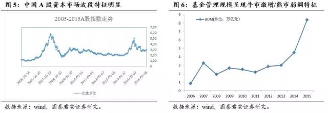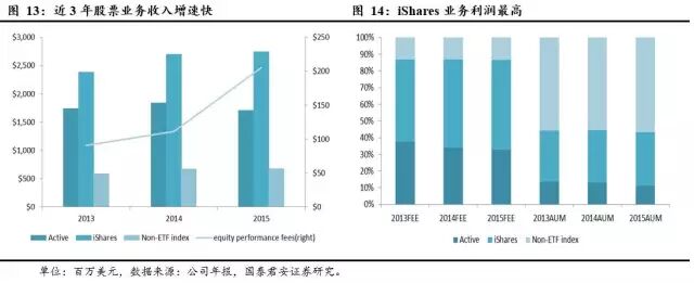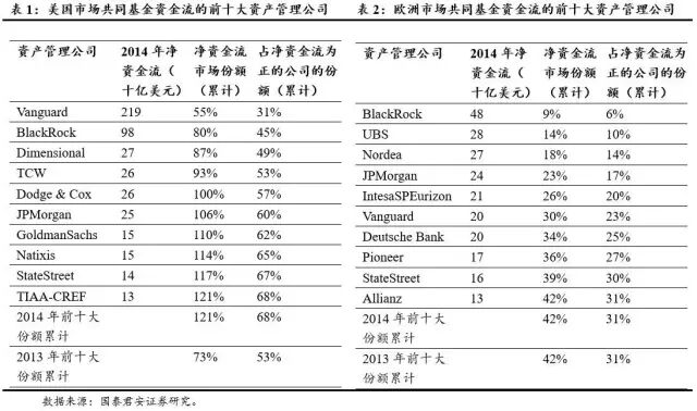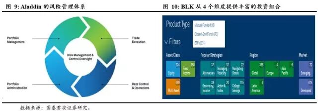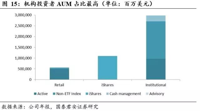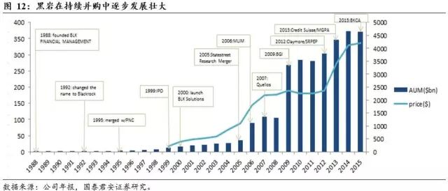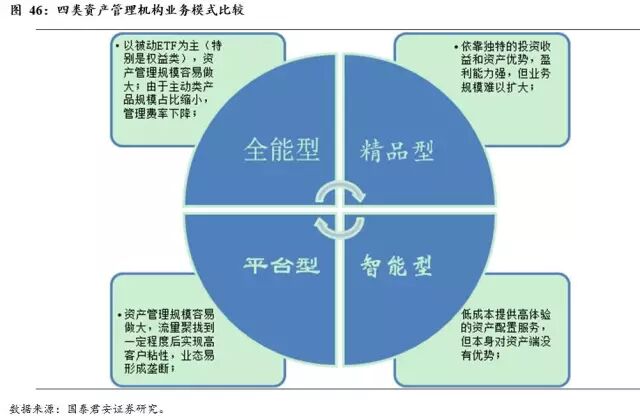 序:资产配置的最迫切时代 随着货币供给加速和中国居民财富积累,中国资产管理行业拥有近百万亿元规模。截至2015年底,包括银行理财/信托/保险资管/券商资管/公募基金/基金子公司/私募基金等在内的泛资产管理市场管理资产总规模达到约100万亿元人民币。根据BCG预测,到2020年,中国泛资产管理市场管理资产总额预计达到174万亿元人民币,2015至2020年均复合增长率可达13%;剔除通道业务之后,管理资产总额预计达到149万亿元人民币,2015至2020年均复合增长率达到 17%。 资管规模增长的驱动力在于:宏观经济稳增长带来的财富积累,人口老龄化促进向金融资产转移,互联网等带来的技术创新。同时监管政策环境下,银行等金融机构资产管理业务也在主动转型。根据银行团队的研究,目前银行理财业务与其说是赚取管理费的资产管理业务,不如说是表外的存贷款业务;当前监管导向下,未来银行有望设立资产管理子公司,回归资产管理业务本源,这会扩张资产管理业务规模。此外,全球有近10万亿元以上资产处于负利率环境中,波动率加大,资金的全球配置需求也在显著提升。 在美国,权益资产作为“牛长熊短”的资产,对蓝筹股Buy and Hold策略为资管相对合适的投资策略(参见西格尔《投资者的未来》中实证结果)。而在新兴市场,个股波动率高,投资中枢波幅大,估值端常发生迅速拉升和崩塌,系统风险显著。这种情况下,在新兴市场单纯持股并非最优的财富管理策略,针对多类别资产的配置策略更具稳定性。相关资产包括对股票、股权、债券、类现金、房地产、商品、艺术品等多类别产品的优化配置。 我们本报告主要梳理美国基业长青的资产管理机构发展历程,并分析其成功的产品设计策略。当然南橘北枳,中国资产管理机构的发展更依赖于对中国制度环境的认识和应变,我们的分析也是管中窥豹。 1.美国资管业:格局集中/策略差异/技术智能 从行业属性看,美国资管机构体现了格局集中、策略差异、技术智能等主要三个特征。我们将对针对北美典型的资管机构发展进行分析。 格局集中:美国拥有一大批全球资产规模最大的基金公司,包括Vangaurd,BlackRock等。据统计,从1995年到2012年,美国市场规模最大的5家资产管理公司市场份额从34%提高到了40%,前25的资产管理公司管理的市场份额达到73%。主要原因是大基金公司品牌大,渠道广且产品线丰富。 策略差异:大型基金公司主要依靠ETF产品,即发行行业指数基金,精品型的资产管理机构主要依靠特定的投资策略,如对宏观对冲/不良债权/私募股权投资等有独特策略;也有部分机构放弃资产端而抢占流量端,这体现为在平台上聚拢流量,同时提供配置ETF组合的服务。 迈向智能:美国的Wealthfront,Betterment开创了人工智能理财产品的先河,即通过优化程序为客户“量体裁衣”,设计组合配置策略;近年来美国大型资管机构也在跟进,如资管巨头Vanguard近年也在大力推进人工智能理财产品。 2.巨头型:黑岩的崛起 随手打开《中国证券报》、《经济观察报》或类似的刊物,总是能发现许多分析师或经济学家在讲话。他们背后都有一些非常显赫的名字:GS,MS, ML, DB等等。如果只看这些刊物,我们很容易把这些名字理解为金融市场的主角,是它们决定了价格、成交量和一切走势。但这不是事实,因为它们只是中介商。对外行而言,它们拥有一个气派的名字:投资银行(InvestmentBank),而内行一般把它们称为“经纪商/自营商”(Broker/Dealer),这精辟地描述了它们的两大功能:帮助客户进行融资和交易,用自己的资本进行投资和投机。 ML, Citi和许多其他投资银行没有自己的投资管理部门,GS,MS和DB的投资管理规模大致在2000-5000亿美元之间,听起来挺吓人的。但是很少有人听说以下的名字:Fidelity拥有1.4万亿美元,StateStreet拥有1.2万亿美元,CapitalGroup拥有大约1万亿美元,Vanguard拥有8000亿美元。以上任何一家都相当于三到四家顶级投资银行的资产管理规模。所以,当中国私募基金挺进香港,声称要把GS和ML赶出去时,他们完全错误理解了金融市场的角色关系。他们不应该把经纪人赶出去,因为经纪人是为所有人提供服务的,否则市场无法运转。 金融投资的10个谎言之:我们在报纸上看到的名字是金融市场的主角 ——以上文字摘录自《人大经济论坛》 2.1.战略:持续对外扩张的资管巨头 作为全球最大的资产管理机构,Blackrock(译为黑岩,简称BLK)的股权结构较为分散,内部股东持股比例仅有5%,机构和共同基金持股比例占71%,但持股比例较为分散。 1988年Blackrock由拉里•芬克和苏珊•瓦格纳等8人建立。最初,芬克得到了全球最大私募黑石集团皮特•彼得森的初始经营资本的稳定资助。彼得森相信芬克做致力于风险管理领域公司的眼光,于是为公司命名为“黑石财务管理”。成立之初,公司主要业务时固定资产投资。1992年,由于与大私募集团黑石的名字会产生混淆,他们决定从“黑石财务管理”改名为“黑岩”。当年公司资产管理规模(以下简称AUM)为170亿美元,1994年,AUM为530亿美元。 对外通过并购扩张,在内夯实技术中台系统,这成为黑岩的发展战略。1995年,PNC金融服务集团收购了BLK,这一并购让BLK的业务变得更加多元化,从封闭型基金、信托拓展到开放型基金,包括股票基金。同时,BLK的分销网络和投资机会也因此增加。 1999年,BLK以每股14美元的价格在纽约证券交易所公开上市,AUM为1650亿