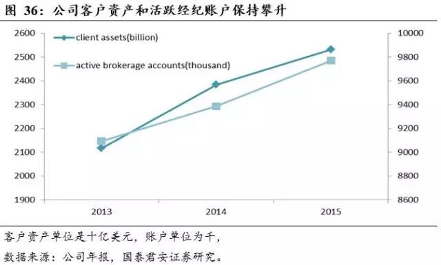 由下图知,公司资管收入中共同基金服务费近年来有所下降,而投资管理咨询费及其他收费则有所上升。这由于2000年后,随着投资者对研究服务依赖度提升,嘉信理财退出了不收取咨询费用的“共同基金全一账通”服务。
