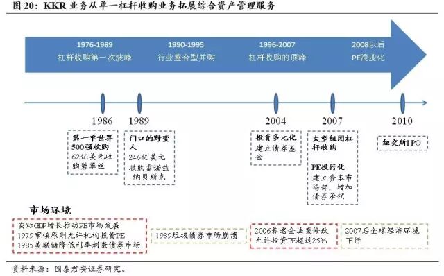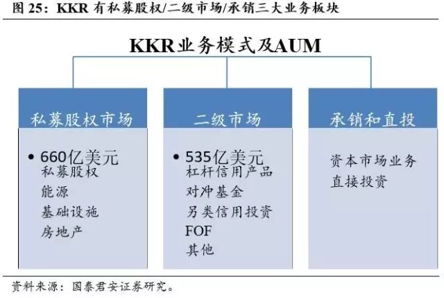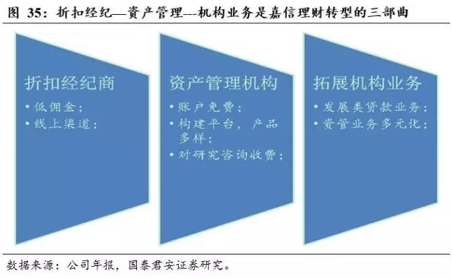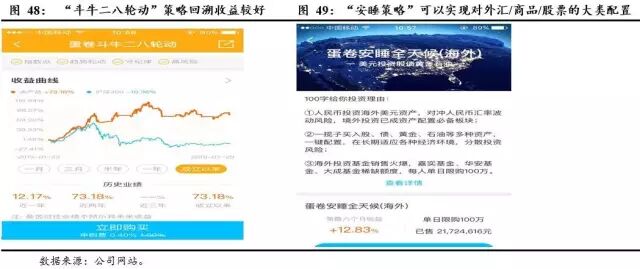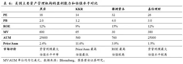 7.1. 经验:资产管理是金融业态的好生意 上文分析了海外资产管理的四类运营模式,我们同时比较了四类机构的盈利能力和估值水平。整体上,从盈利能力看,橡树资本最高(15%),其余三类保持在10%以上;从资管规模看,嘉欣理财和黑岩都可以管理2万亿美元规模,这与市值情况相一致,嘉欣理财和黑岩都可以成长为300亿美金的大市值机构,KKR和橡树市值在百亿元以内;从价值驱动看,KKR、橡树资本对资产端有控制能力,Price/Aum较高,而嘉欣理财主要做流量聚拢和资产配置,Price/Aum最低;从估值水平看,橡树资本和嘉欣理财估值水平较高,前者体现了资本市场对其针对不良债权定价能力(独特投资策略)的溢价,后者体现了聚拢流量、构建平台后的“护城河”价值,KKR的估值水平最低,这与公司有较多自营业务有关(成熟市场自营业务估值中枢1PB左右)。 我们同时分析了中国基金行业,相关模式特征与美国同行一致。由于规模扩张不需要消耗资本,中国公募基金能保持“轻资产”运营模式,ROE水平更高,2014/15年,中国主要基金公司ROE在20%以上,而同期中国券商的ROE水平约10%(2014年)/15%(2015年)。有趣的是,中国公募基金存续规模表现出“牛市规模激增,熊市规模阴跌”的特征。即使在熊市,基金资产管理规模也可以保持较高的水平,这也许可以用行为金融解释,如基金投资者(大妈们)在产品七毛以下时常因心理账户、损失厌恶等原因不愿意赎回。这种策略下,中国公募基金的存量规模长期看可以保持稳定增长。 中国的智能投顾也在发展中,目前包括京东金融等机构也参与了人工智能选股和智能配置。除了推荐个股外,相关机构主要还是以“做选择题测算风险偏好—提供风险配置”方案为主,本质上还是一个静态的配置方案。但也有部分机构可以展示策略提供动态化的资产配置过程,我们认为其对资产管理的理解已走到海外同行。我们以雪球研发的蛋卷基金举例说明。 蛋卷基金对市场上的产品进行选择,主要按照 “安睡计划” 和 “斗牛计划” 两个类别推荐。安睡计划针对债券基金、货币基金,面向要求资产稳健增值的用户。斗牛计划是股票基金,主要针对高风险偏好客户。近期蛋卷基金与天弘基金联合推出「蛋卷斗牛二八轮动」,主要是针对大类资产配置的视角研发产品。 该策略基于根据趋势跟随大小市值轮动的策略编制,成分标的为沪深300指数、中证500指数和国债指数:该策略对比当前交易日收盘数据与二十个交易日前的收盘数据,选择沪深300指数和中证500指数中涨幅较大的一个,于下一个交易日收盘时切换为持有该指数;若两个指数均为下跌,则于下个交易日收盘时切换为持有国债指数。回测结果表明,该策略在牛市可以较好把握主升行情,在熊市可以实现低仓位运作。 7.2. 选股:参股基金/资产优势/互联网理财三主线 东方证券(600958):公司通过全资子公司东证资管开展资产管理业务,通过持股 39.96%且作为第一大股东的汇添富基金开展基金业务,通过全资子公司东证资本从事直接投资业务。以资产管理业务为例,管理规模突破千亿,且80%以上为主动管理产品,在行业里处于领先地位。 广发证券(000776):通过控股子公司广发基金和参股公司易方达基金开展基金管理业务。截至 2015年底,广发基金资产管理规模行业排名第7,易方达基金资产管理规模行业排名第3。 兴业证券(601377):公司持有51%兴业全球基金股权和100%兴证证券资产管理有限公司,相关机构在资产管理领域具有良好口碑。 基于有独特投资策略的资管机构发展路径,推荐在资产端有优势的资管机构。维度2:建议增持华声股份/华西股份/九鼎投资 华声股份(002670):有PE/VC背景的新一代互联网金控平台:国盛证券在江西地区耕耘多年,民营股东入主后,有望体现成长性;大股东体外有优质一级市场资产,后续争取保险牌照,一二级市场联动预期提升资产端优势。 华西股份(000936):转型推进,一二级市场布局逐步完善。公司在文化娱乐/TMT /健康医疗/跨境半导体技术领域成立并购团队,积累优质待证券化项目,布局渐成熟。股权激励实施(行权价8.06元)将促进管理层利益绑定。 九鼎投资(600053):九鼎集团唯一上市平台,公司未来将形成以并购为主的PE投资、VC投资、不动产和固定收益投资三大模块。经济结构转型提升PE/VC行业景气,公司作为行业龙头受益。 维度3:基于互联网理财(包括具有理财属性的保险品种),受益标的:东方财富/焦点科技 东方财富(300059):公司基于核心流量优势,第一步基金销售实现变现,第二步获得券商牌照后导流成果值得期待。公司志在打造互联网金融一站式平台,近期资本市场低迷后业绩和估值均双杀,但公司在流量方面已经近千万客户积累,这为后续转型奠定基础,存在显著超预期。 焦点科技(002315):公司旗下的慧择保险和新一站保险分别位列中国互联网保险第三方中介平台的第一名和第三名,保险佣金2016年持续延续高增长。公司现有产品线有望由传统互联网保障型保险转向理财型保险,保费规模有望继续攀升。 8. 核心风险 市场大幅调整 资产管理机构盈利模式与证券市场行情走势相关性较强,如果证券市场行情走弱,基金募集和管理等业务的经营难度将会增大,盈利水平可能受到较大影响。而我国证券市场行情又受到国民经济发展状况、宏观经济政策、财政政策、货币政策、行业发展状况以及国际证券市场行情等诸