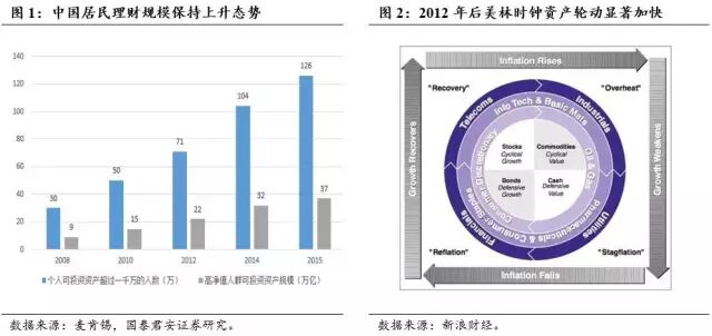 来源:欣琦看金融 作者:刘欣琦/孔祥 轻金融编辑整理 摘要 业务空间加速扩张,牌照持续放开,中国资产管理行业机遇与挑战并存。(1)行业空间重估:宏观经济稳增长带来财富积累,人口老龄化促进向金融资产转移,互联网等提升技术创新,全球负利率环境加大资产波动率,居民资产管理进入了最迫切的时代。(2)新进入者加剧:监管加剧下,传统银行理财由表外监管套利回归资产管理本源,银行资金和渠道优势明显;券商资管、险资、私募陆续新获公募牌照,群雄逐鹿,胜负难断。(3)跨市场跨领域需求加大:新兴市场权益市场波段性明显,单纯持股并非最优的配置策略。针对多类别股票/股权/债券/商品资产的配置策略更具收益能力和盈利稳定性。 美国资管机构体现了格局集中、策略差异、技术智能等主要三个特征,四类机构杀出重围,格局渐明。(1)全能型:产品(特别是权益类产品)以被动类ETF为主,注重行业的横向并购整合,相关巨头均有万亿美元管理规模,黑岩/先锋/富达为代表;(2)精品型:依赖于特定投资策略或针对特定资产的定价能力,主动能力提升但规模扩张受限(难以超过500亿美元管理规模),KKR/橡树/桥水是翘楚;(3)平台型:早期通过免费策略聚拢中等收入客户,后续通过精选顾问优化理财配置,寡头效应明显,也能管理万亿元资产规模,但缺乏资产端优势,嘉欣理财成典范;(4)智能型:基于大数据技术,面向年轻群体提供低成本的理财策略,Kensho/Wealthfront/Betterment露头角。(5)北美资管机构估值中枢高于投资银行,资本市场给予精品型和平台型资管以机构以估值溢价,而全能型和平台型更容易成长为百亿美元以上的大市值公司。在智能型领域,“独角兽”常出没。 弱周期/高盈利,海内外经验均表明资产管理行业是个好生意。(1)资产管理业周期属性弱于券商,同时资产管理机构业务扩张不依赖大量占用资本,中国代表性的公募基金2014-15年ROE平均20%,高于券商。(2)中国公募基金存续规模表现出“牛市规模激增/熊市规模阴跌”的不对称特征。即使在熊市,基金管理规模也可保持较高水平,这也许可用行为金融学(产品低于一定阈值后基民不愿意赎回)。基于此,长周期视角下基金管理规模可以保持稳定增长。 基于参股基金/资产优势/互联网理财三主线选股。基于参股基金,建议增持东方证券/广发证券/兴业证券,基于资产端优势,建议增持华声股份/华西股份/九鼎投资,在互联网理财领域,受益标的:东方财富/焦点科技。 核心风险:政策监管风险,市场大幅调整。
