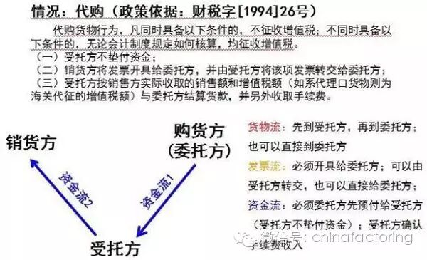(3)资金流:必须委托方(购买方)先预付给受托方,受托方再支付给销售方(受托方不垫付资金,政策依据为财税字[1994]26号)
