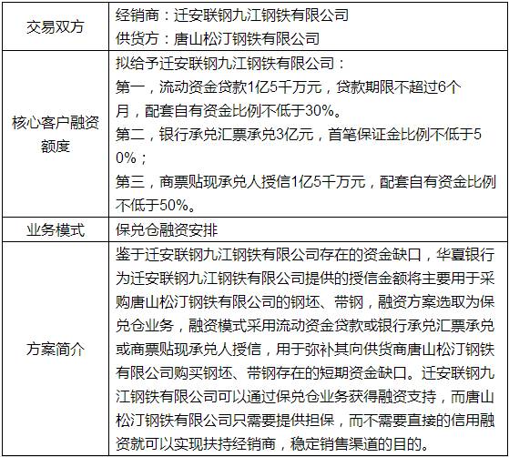 鉴于迁安联钢九江钢铁有限公司存在的资金缺口,华夏银行为迁安联钢九江钢铁有限公司提供的授信金额将主要用于采购唐山松汀钢铁有限公司的钢坯、带钢,融资方案选取为保兑仓业务,融资模式采用流动资金贷款或银行承兑汇票承兑或商票贴现承兑人授信,用于弥补其向供货商唐山松汀钢铁有限公司购买钢坯、带钢存在的短期资金缺口。迁安联钢九江钢铁有限公司可以通过保兑仓业务获得融资支持,而唐山松汀钢铁有限公司只需要提供担保,而不需要直接的信用融资就可以实现扶持经销商,稳定销售渠道的目的。
