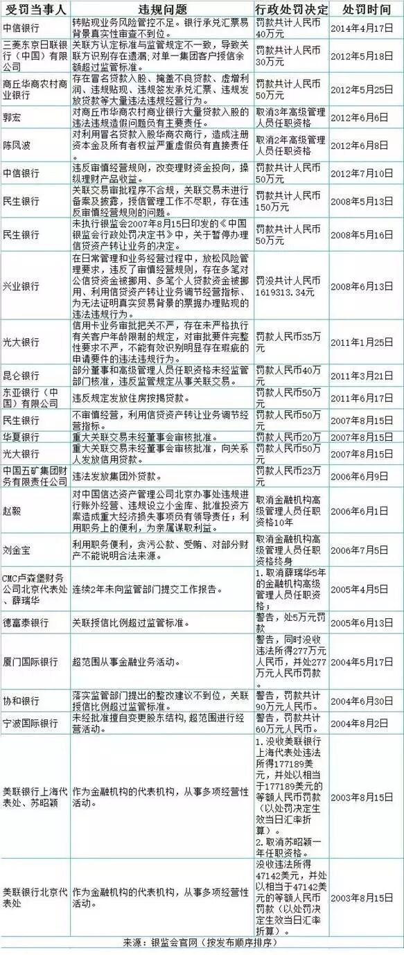 受罚的外资行亦有7家,分别是三菱东京日联银行(中国)有限公司、东亚银行(中国)有限公司、德富泰银行有限公司、厦门国际银行(注:该银行受罚时为中外合资银行,其于2013年改制成为中资商业银行)、协和银行、宁波国际银行、美联银行(注:美联银行上海代表处和北京代表处分别接到一张罚单)。