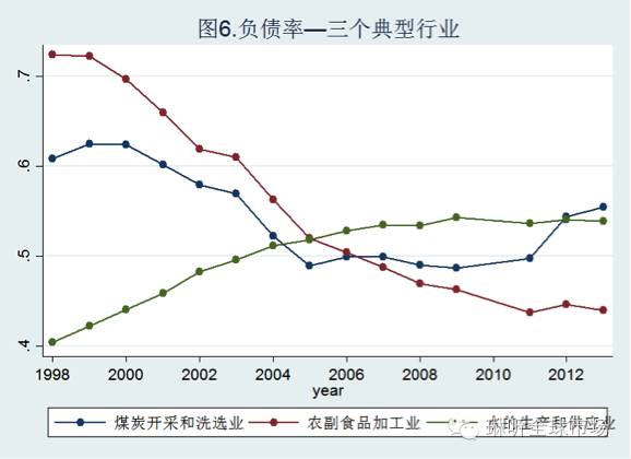 按国民经济行业分类标准的二级行业可以将所有样本企业分成39组。整体上,钟宁桦的研究观察到,重工业企业的平均负债率下降的幅度要小很多。比如,图6中画出了几个典型行业的平均负债率。其中,农副食品加工业从1998年近72%骤降到2008年的47%。而属于重工业的煤炭开采和洗选业的负债率从61%降至2009年的49%,随后又上升至2013的58%。此外,公用事业企业即包括电力、热力、燃气、和水的生产和供应类企业的平均负债率都有一个显著上升的趋势。图6中就显示,水的生产和供应企业的平均负债率从40%上升至55%。