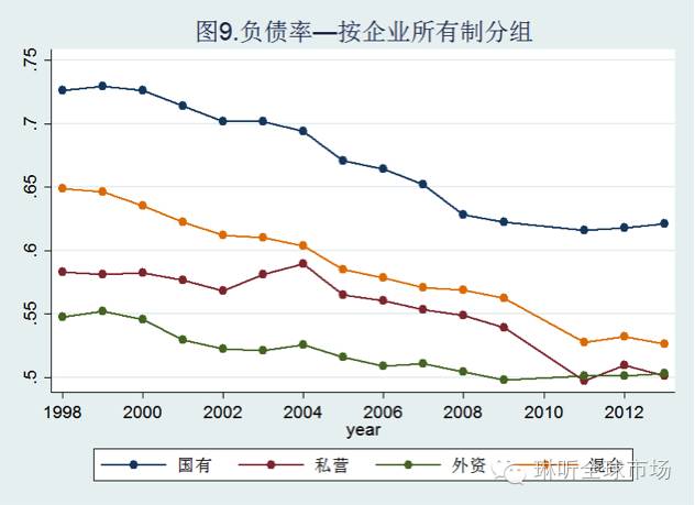 图9还显示,在99-13期间内,国有企业的负债率的下降幅度是最大的。然而,关于企业的所有制和资本结构之间的关联,更有趣的结果是在图10中。图10描述了1998-2013期间持续存在的、稳定的企业的负债率,国有组从1998年的59%上升到2013年的62%;而其他所有制企业组的负债率都是下降的。