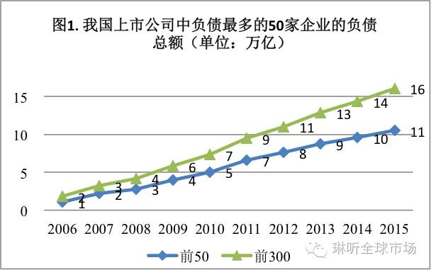 此外,如图1所显示的,负债最多的这50家上市企业在2006年时的负债总额约为1万亿,在之后的9年中,这50家企业的新增负债近10万亿,这意味着,它们平均每年新增负债1万多亿。