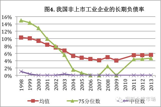 钟宁桦按不同的期限把负债作了区分,发现平均短期负债率(短期负债/总资产)从1998年的55%下降至2013年的47%;如图4所示,平均长期负债率(一年期以上负债/总资产)从1998年的11%降至2013年的6%。