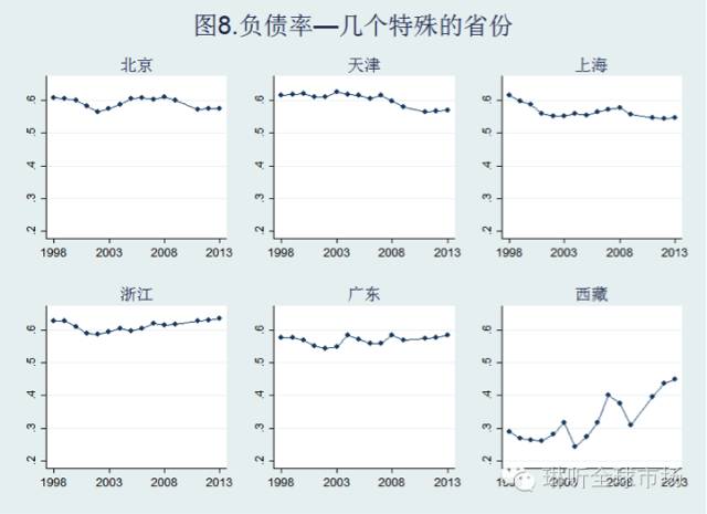他随后对每个省的平均负债率都做了考察,图8显示,有五个省份的负债率比较稳定,包括北京、上海、天津、广东和浙江。此外,西藏是所有省份中唯一的一个平均负债率显著上升的,不过西藏在1998年的初始水平很低。