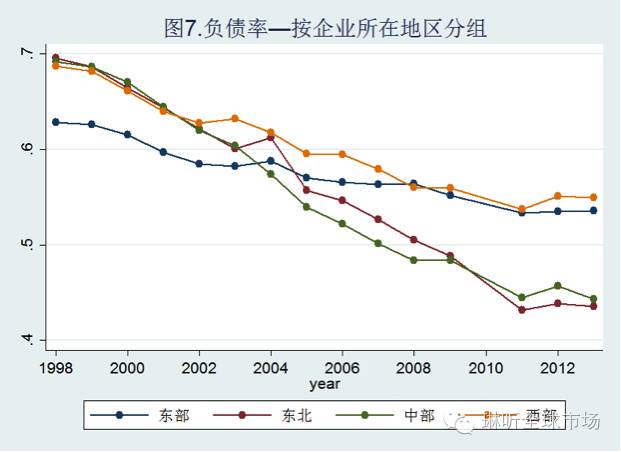 三是东北和中部地区企业的平均负债率下降的幅度最大,超过20%;东部发达地区企业的平均负债率相当稳定。