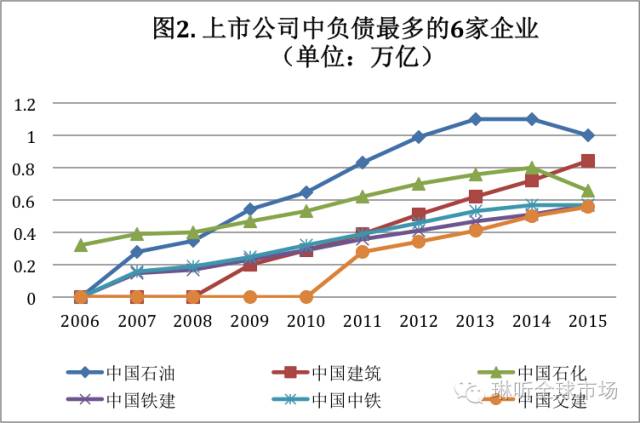 在上市公司中,负债最多的单个企业是中国石油,这一家企业2015年的负债就达到1万亿元人民币。负债排名2-6位的企业依次是:中国建筑、中国石化、中国铁建、中国中建和中国交建,这5家企业的负债总额超过3万亿元。图2显示,在过去十年中,这6家企业的总负债都在急剧上升。