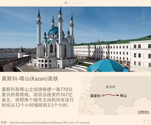 中国企业牵头的一个财团去年赢得莫斯科喀山高铁一项3.75亿美元的合同。莫斯科和喀山之间将修建一条770公里长的高铁线,项目总投资约167亿美元,将把两个城市之间的列车运行时间从12个小时缩短到3.5个小时。