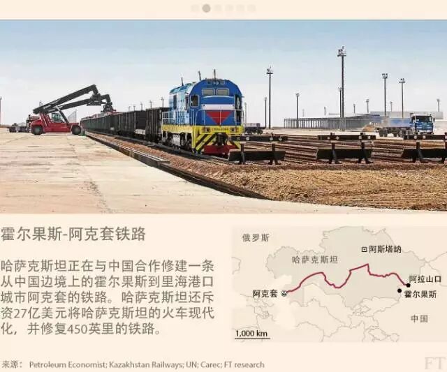 去年5月,哈萨克斯坦总统努尔苏丹•纳扎尔巴耶夫(Nursultan Nazarbayev)宣布了一项计划,将与中国合作修建一条从中国边境上的霍尔果斯到里海港口城市阿克套的铁路。该项目与哈萨克斯坦一个27亿美元的项目对接,后一个项目是实现哈萨克斯坦火车机车、货运和客运汽车现代化,并修复450英里的铁路。