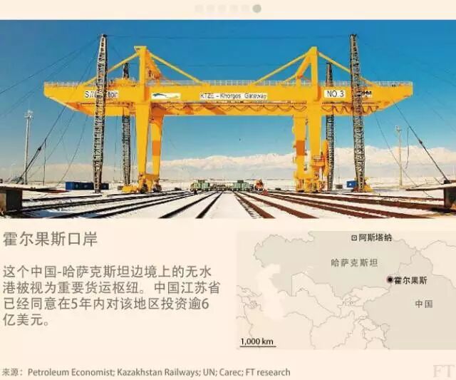 这是中国-哈萨克斯坦边境上的一个无水港,被视为新丝路上的重要货运枢纽。该陆路口岸在去年8月投入运营。中国江苏省已经同意在5年内投资逾6亿美元,在霍尔果斯一带建设物流和工业区。