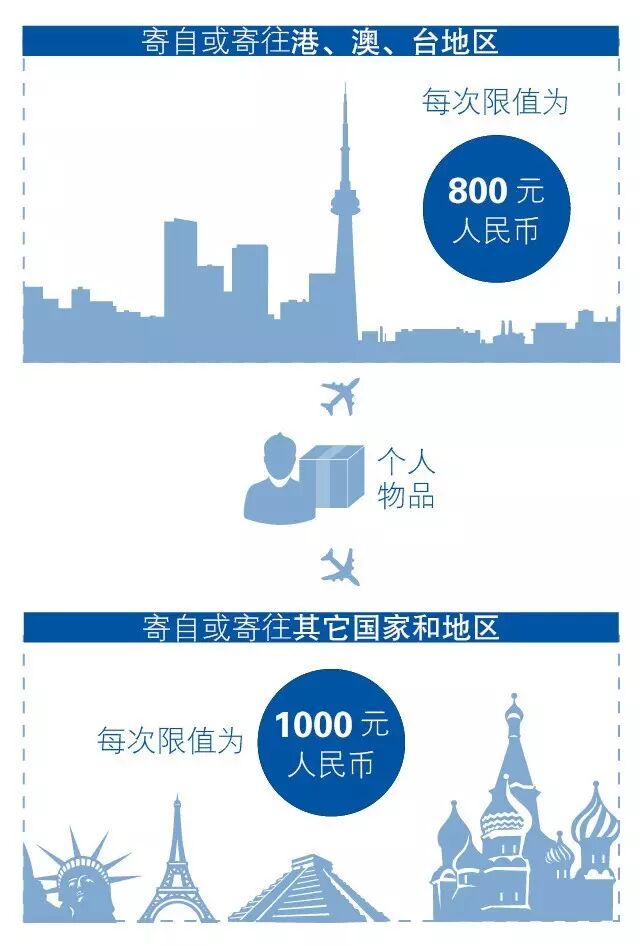 同时,个人进出境邮包是有限值的,不同地区和国家是有区别的: