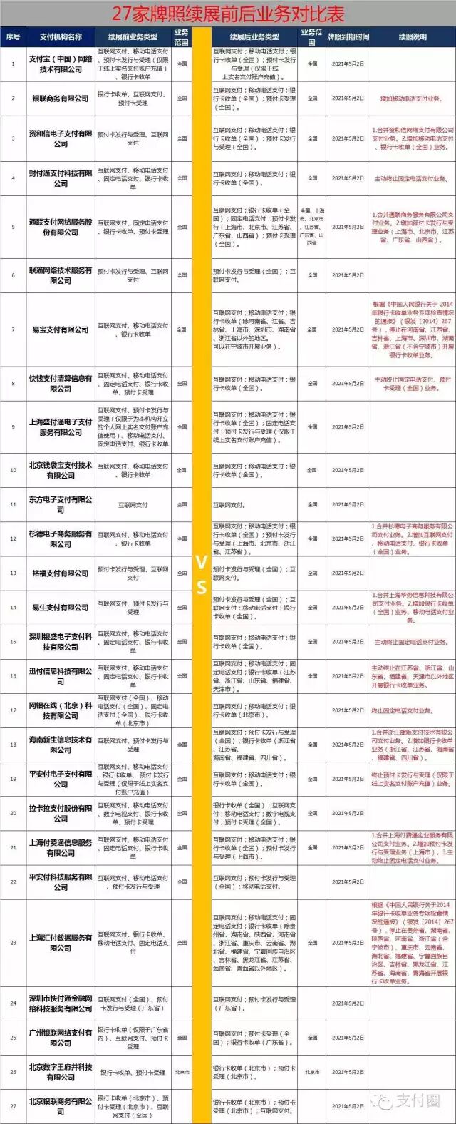 来源/央视财经微信内容梗概在到期逾三个月后,近日中国央行对27家非银行支付机构支付业务许可证续展申请作出决定,续展有效期为五年,截止日期