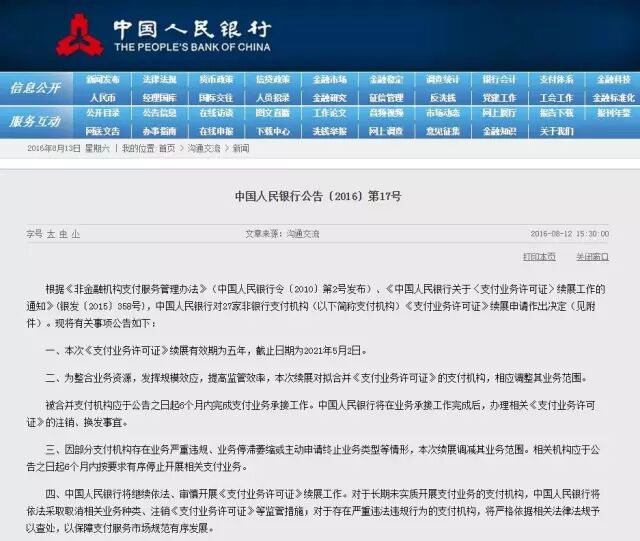 在到期逾三个月后,近日中国央行对27家非银行支付机构支付业务许可证续展申请作出决定,续展有效期为五年,截止日期为2021年5月2日。