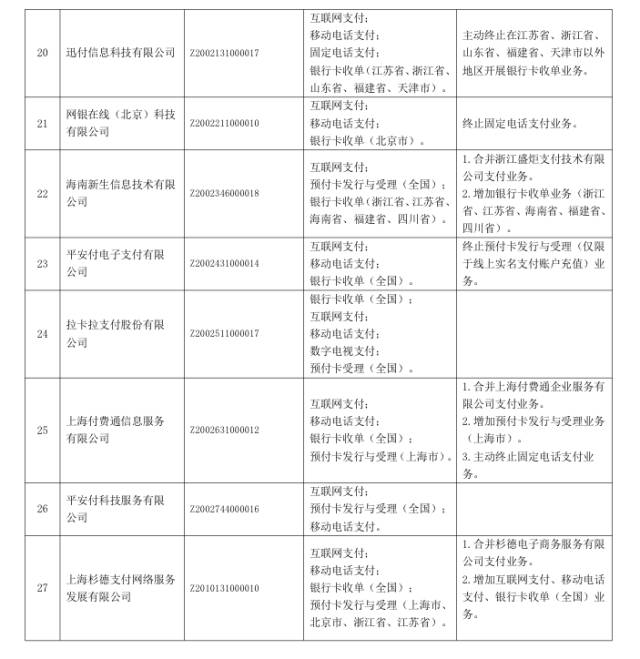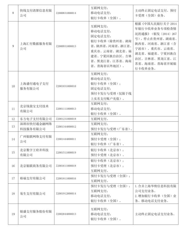 其中,易宝支付被停止在河南省、江西省、 吉林省、上海市、深圳市、湖 南省、浙江省(不含宁波市)开展银行卡收单业务;汇付被停止在贵州省、湖南省、 陕西省、河南省、浙江省(含 宁波市)、重庆市、云南省、 湖北省、福建省、宁夏回族自治区、吉林省、黑龙江省、江 苏省、海南省、青海省开展银行卡收单业务。