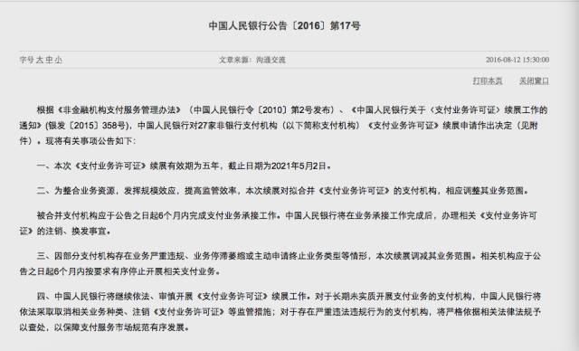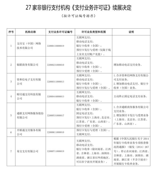 中国人民银行官网消息,根据《非金融机构支付服务管理办法》(中国人民银行令〔2010〕第2号发布)、《中国人民银行关于〈支付业务许可证〉续展工作的通知》(银发〔2015〕358号),中国人民银行对27家非银行支付机构(以下简称支付机构)《支付业务许可证》续展申请作出决定(见附件)。