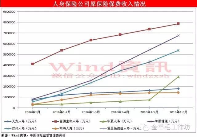 截至2016年6月,寿险当月规模保费达2444亿元,累计达2.28万亿元。从规模保费排名来看,中国人寿、安邦人寿、平安人寿坐稳全行业前三把交易。其中,安邦人寿自4月跃居第二位后,规模保费收入持续上涨。仅4月到6月,安邦人寿市场份额从9%升至10%,保费规模达到了2284亿元。