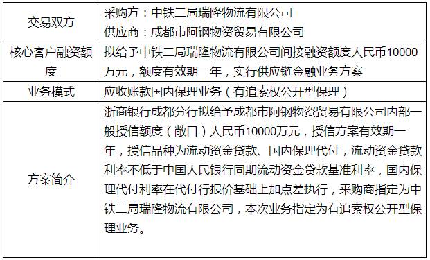 给予成都市阿钢物资贸易有限公司内部一般授信额度(敞口)人民币10000万元,授信方案有效期一年,授信品种为流动资金贷款、国内保理代付,采购商指定为中铁二局瑞隆物流有限公司。