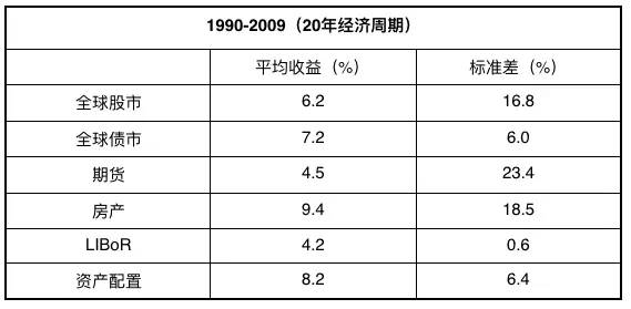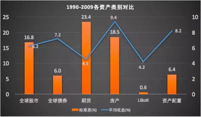 图中可以看出,从20年的经济周期来看,单标的的投资平均收益除房地产外皆低于资产配置的效率。仅有房产一项高于资产配置。但反应风险的标准差,房产类目却是资产配置的近3倍。单从收益率来看,买房产似乎是很不错的选择,但人们往往忽略了风险的因素。