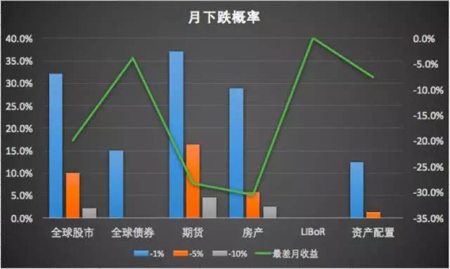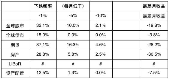 月下跌概率(Monthly Downside Frequency)。下图中衡量的是月化下不同资产标的的不同程度下跌的概率和最差月收益率。依然是以LIBoR为基准,从图中我们可以看出,资产配置中月化下跌1%的概率是最小的,甚至小过债券类。而股市期货和地产则分别高达30%。这意味着单纯投资这三类标的,有30%的概率在买进的一个月内就出现亏损的情况。月亏损5%的情况中,期货依然是风险最高的标的之一,股票第二,房产则温和了许多。毕 竟房市不会出现短时间内暴跌的情况。