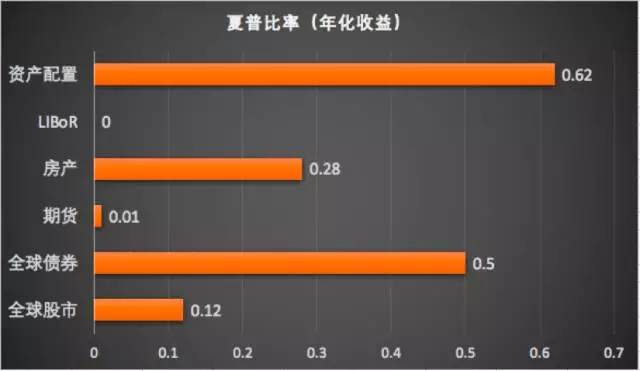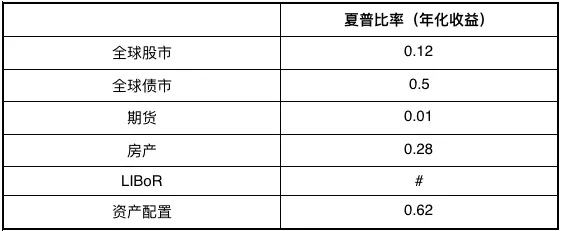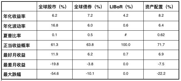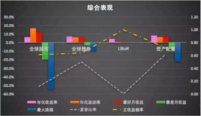 下图综合表现图表结合了上述所有数据并加入了最好月收益的数据来补充说明。图中我们可以看到在以LIBoR为基准的基础上,资产配置的年化收益率是最高的,而年化波动率方面则与债券基本持平。