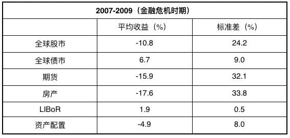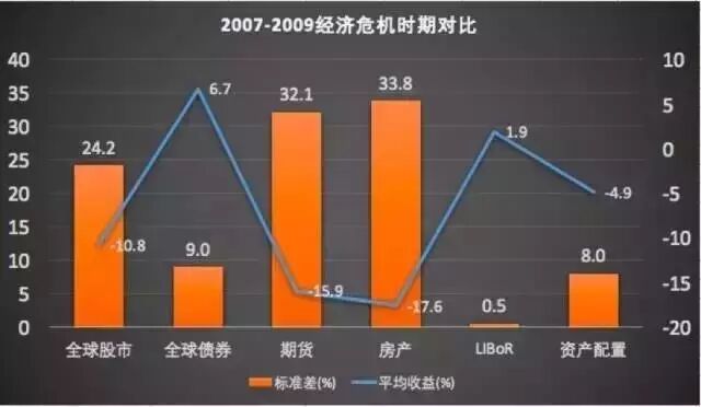 下图展现了07-09年金融危机时期各资产类目的收益率与标准差对比。图中可以明显看出在金融危机时除债券以及银行利率等固定收益类保持正收益外其他都出现严重的收益率下滑并为负值。