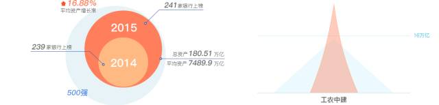2015年中国金融500强中有241家银行上榜,较2014年增加了2家,上榜银行总资产180.51万亿,平均资产为7489.9亿元,平均资产年增长率为16.83%。其中,工农中建四大行资产均超过了16万亿。与2014年比,银行业资产增速有所回落。