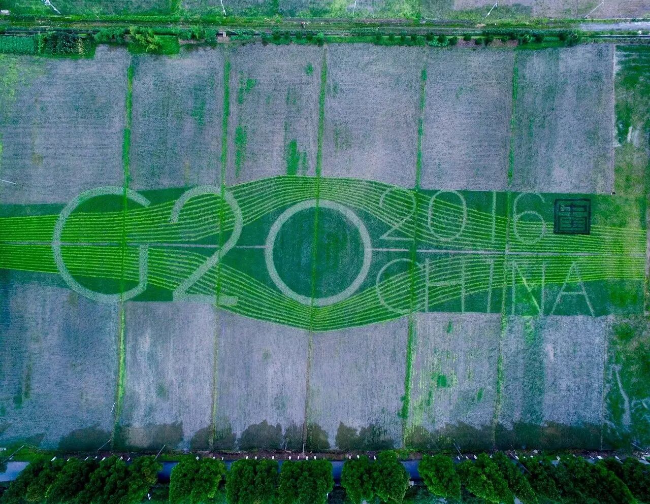 (杭州余杭区良渚街道大陆村的稻田里,一个宽逾百米的G20峰会LOGO清晰可见,这巨幅的图案是由五彩水稻秧苗组成的。)