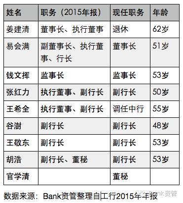 前董事长姜建清在工行工作30余年!2000年2月,姜建清履新工商银行行长,彼时年仅47岁,是当时四大行中最年轻的行长,从此也开启了其长达16年掌舵工行的生涯。“我从普通柜员开始就与工行结下不解之缘,几乎经历了所有业务的管理岗位。”姜建清曾表示。前行长杨凯生在工行工作超30年!其1985年进入工行,初始担任工行规划信息部主任,后升任工行深圳分行副行长。后因业绩卓越,再升任工行第四副行长。最终在行长之位退休。现任董事长易会满在工行也已经满30年了!其1985年加入工行工作至今。姜建清掌舵16年,加之相对稳定的高管层,也是工行稳健发展的重要因素之一。一直以来,工行都有内部培养高管层的惯例。当然也不乏如副行长张红力等海外招聘回来的专家。从杨凯生、易会满的经历来看,均是副行长晋升为行长,并且不一定就是第一副行长哦~从姜建清、易会满的经历来看,行长“继位”董事长也是比较顺理成章。从年龄上看,姜建清、杨凯生、易会满晋升行长之位时分别47岁、56岁、49岁。那么,如果从现有工行高管层来看,哪位有可能成为新的行长人选呢?[1]钱文挥:出身金融业“黄埔军校”建行,来工行一年有余公开资料显示,钱文挥在建行工作近20年。其于1985年7月至2003年3月在中国建设银行上海分行工作,历任上海第二支行、综合计划处计划科、计划处、营业部、业务管理总部、信贷部、市场发展部、计划财务部科长、副处长、副总经理、总经理、副行长等职务。2001年10月至2004年10月,钱文挥进入建行总行工作,历任资产负债管理委员会办公室、体改办、资产负债管理部、重组改革办公室主任、总经理职务。2004年10月,钱文挥加入交通银行,出任交行副行长(其中:2005年7月至2006年11月兼任交行上海分行行长),2007年8月起,出任交行执行董事、副行长。是排位第一的副行长。值得一提的是,2010年6月起,钱文挥曾横跨银行、保险、基金三领域,身兼交行副行长、交银康联董事长、交银施罗德基金董事长三职,直至2014年2月,交银康联董事长由现任交通银行副行长兼首席信息官侯维栋接任。2015年初,钱文挥调任工行监事长,接棒年满60岁退休的工行监事长赵林。教育背景:1995年—1998年 上海财经大学工商管理硕士不过,由监事长升任行长之位的案例并不多见。2015年末微众银行原监事长李南青,出任微众银行行长。1991年—1994年,在惠普美国总部做财务经理;