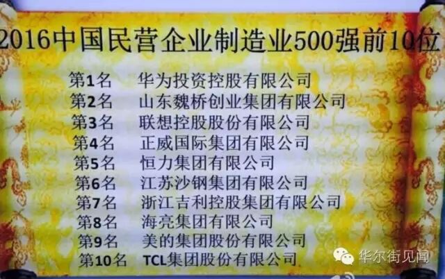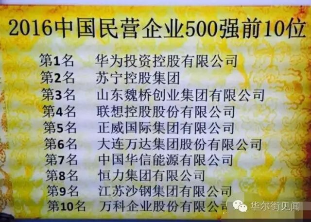 文章来源:华尔街见闻8月25日上午,由全国工商联发布的“2016中国民营企业500强榜单”揭晓。华为控股有限公司以营收总额3590.09亿排名第一,苏宁控股